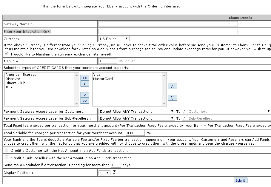 • Total Fixed fee charged per transaction for your merchant account (Per Transaction Fixed Fee charged by your Bank + Per Transaction Fixed Fee charged byEbanx): Your bank andEbanx may charge a fixed fee per transaction, if you choose to pass on this fee to your customers and sub-resellers then you can set the amount in this field